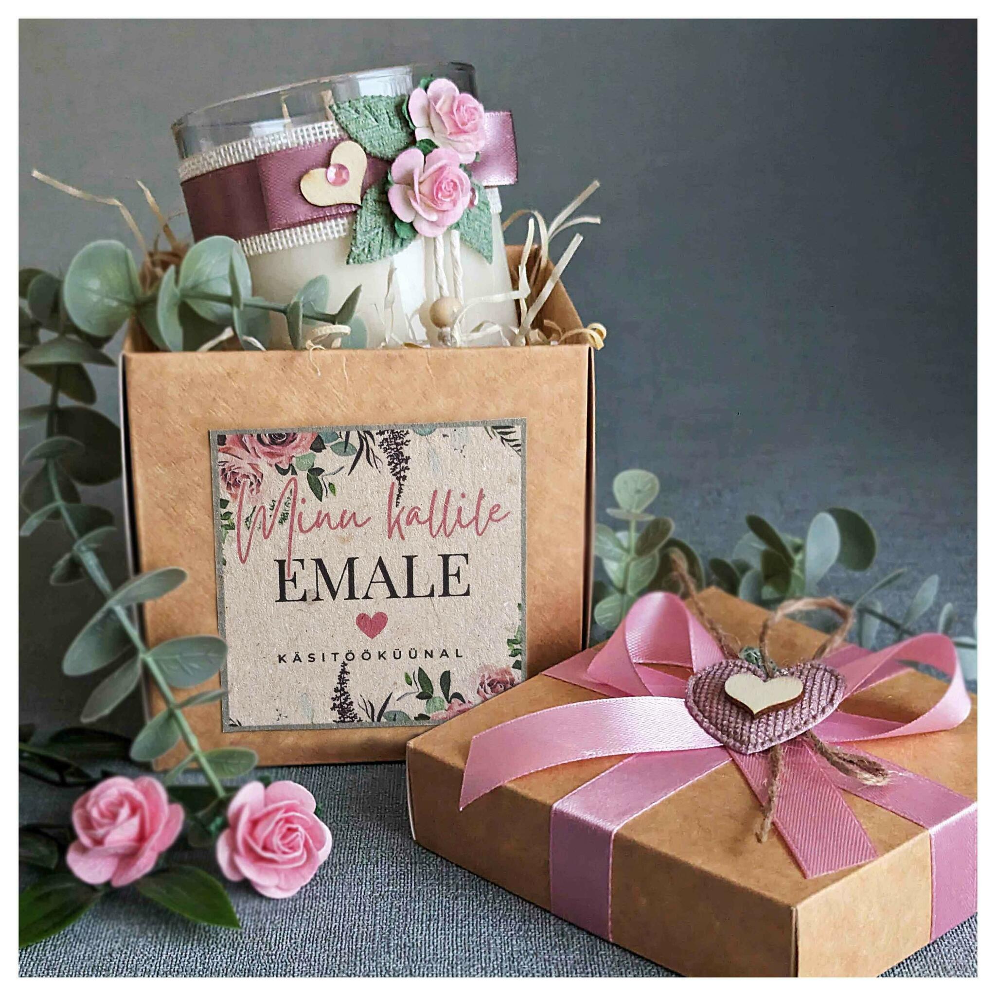 Armas ja praktiline kingitus emadepäevaks kallile emale. Käsitööküünal on valmistatud sojavahast, mis ei sisalda lõhna- ega värvaineid. Puhas ja looduslik küünal on läbipaistvas klaasis. Klaas on kaunistatud paelte, tekstiilist lehtede, mooruspuu paberist lilledega, puidust südamete, puidust pärlite ja kristall kivikestega. Küünal on ilusas kaanega karbis, mis on kaunistatud valmis kingituseks. Karbil oleval sildil on kiri - Minu kallile emale Karbi suurus on 10cm x 10cm x 10cm Sojavaha küünla põlemisaeg on umbes 35 tundi Sojavaha: 180g