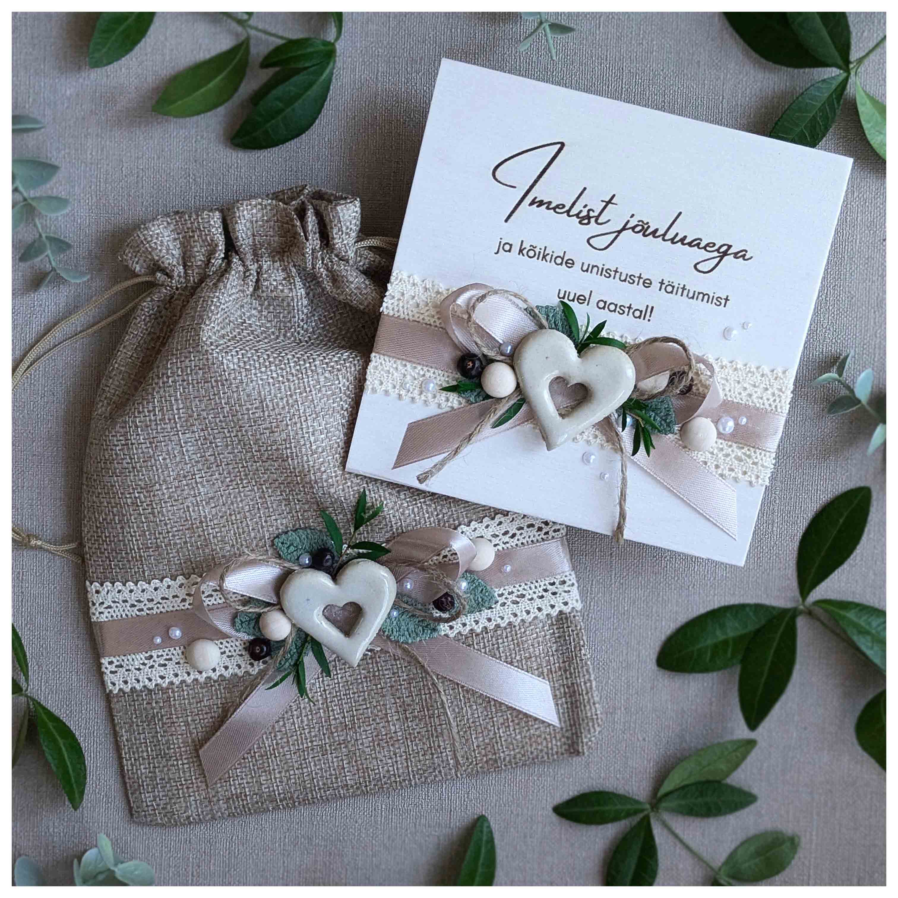 Sellel aastal oleme valmistanud rohkem kinkekomplekte, kus on koos jõulukaart ja riidest kinkekott või hoopis jõulukaart ilusa kinekarbiga.