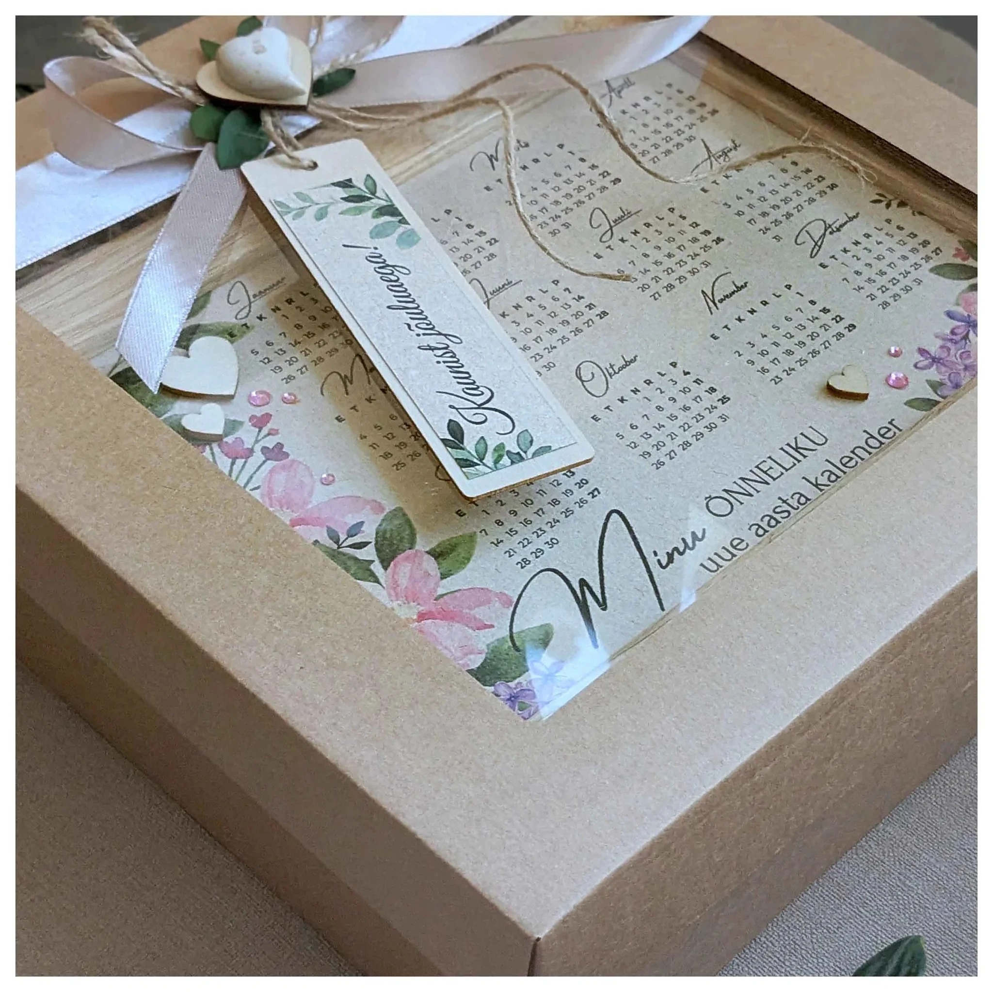 Kalender on pakendatud ilusasse pruuni kaanega kinkekarpi. Karbil on puidust silt, kuhu on kirjutatud: Kaunist jõuluaega. Sildi teisele poolele on looduspaber, kuhu saab kirjutada näiteks kingisaaja nime.