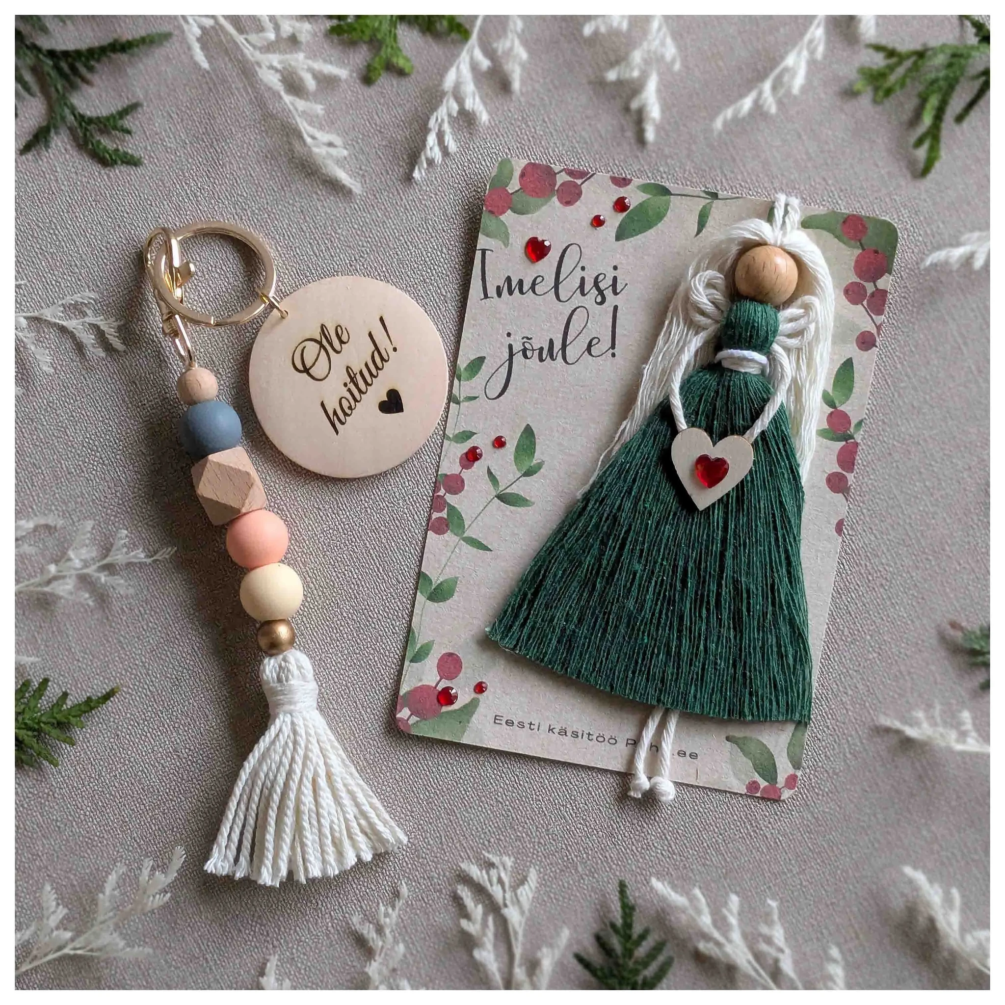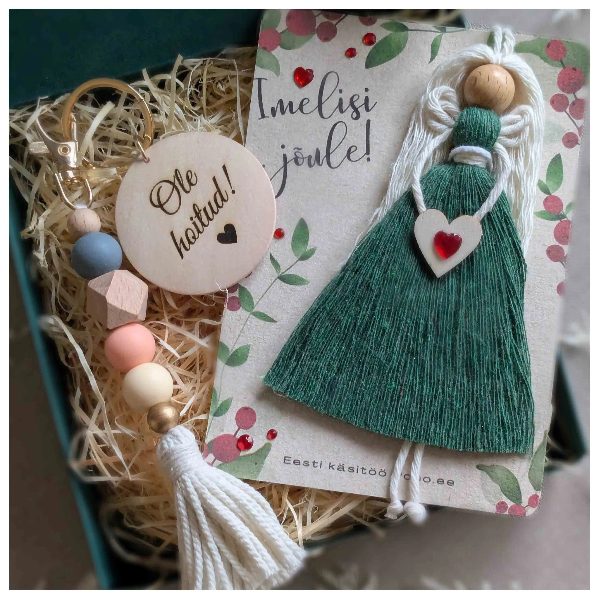 Lisaks kaasas metsaroheline makrameenukk, mis on kinnitatud 15 × 10 cm taaskasutatud looduspaberile. Makrameenuku pikkus on 13 cm ning sellel on aas, millega saab selle mugavalt riputada kuusele, akna ette, oksale, kapinupu külge või autosse.