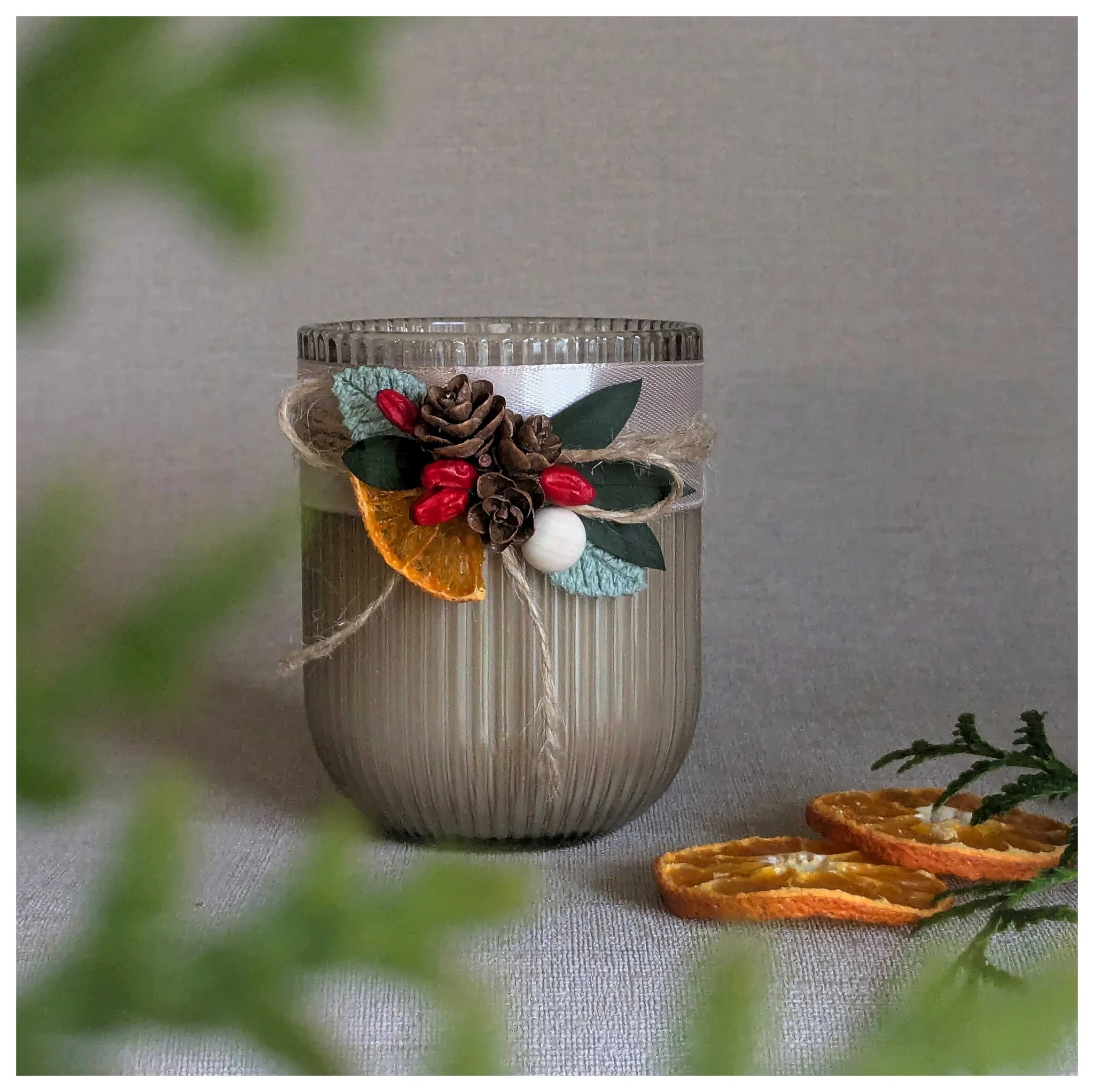 Klaasist anum pakub praktilist kasutust ka pärast küünla ära põlemist – seda võib hiljem kasutada kaunistuseks või väiksemate esemete hoidmiseks. Küünla kaunistamisel oleme kasutanud looduslikke vahendeid, nagu käbid, punased marjad, apelsin, eukalüpti lehed ning käbid.