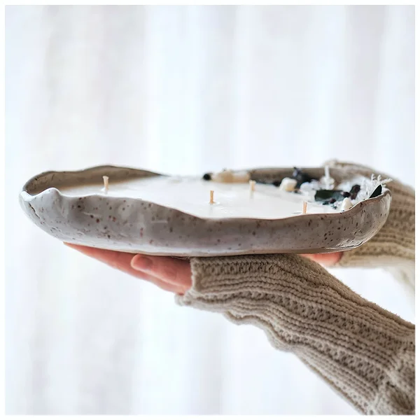 Küünal on kaunistatud stabiliseeritud hortensiaõite, eukalüptilehtedega– need on päris taimed, mille ilu ja värskus on spetsiaalse loodusliku töötluse abil säilitatud, et need püsiksid kaunid aastaid. Lisaks on veel kaunistuses kadakamarju ja kivikesi. Keraamiline kauss on valmistatud kõrgkuumusel põletamisel savist. Kaussi saab hiljem kasutada kööginõuna.