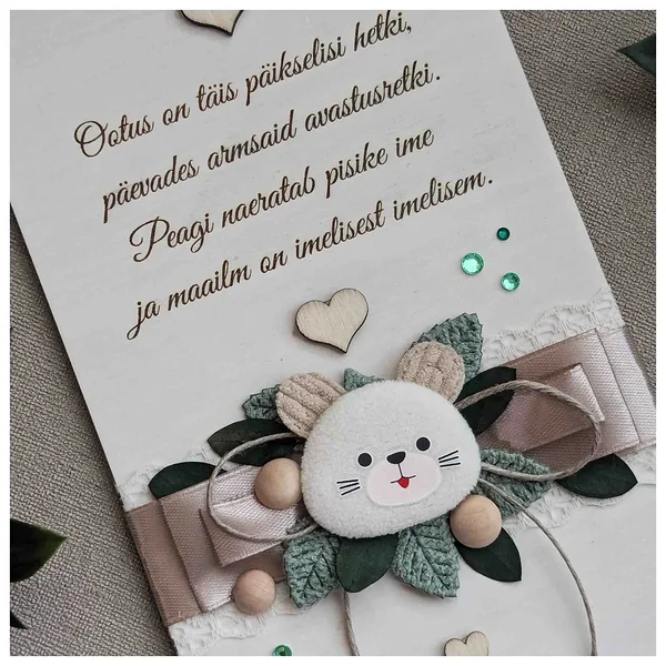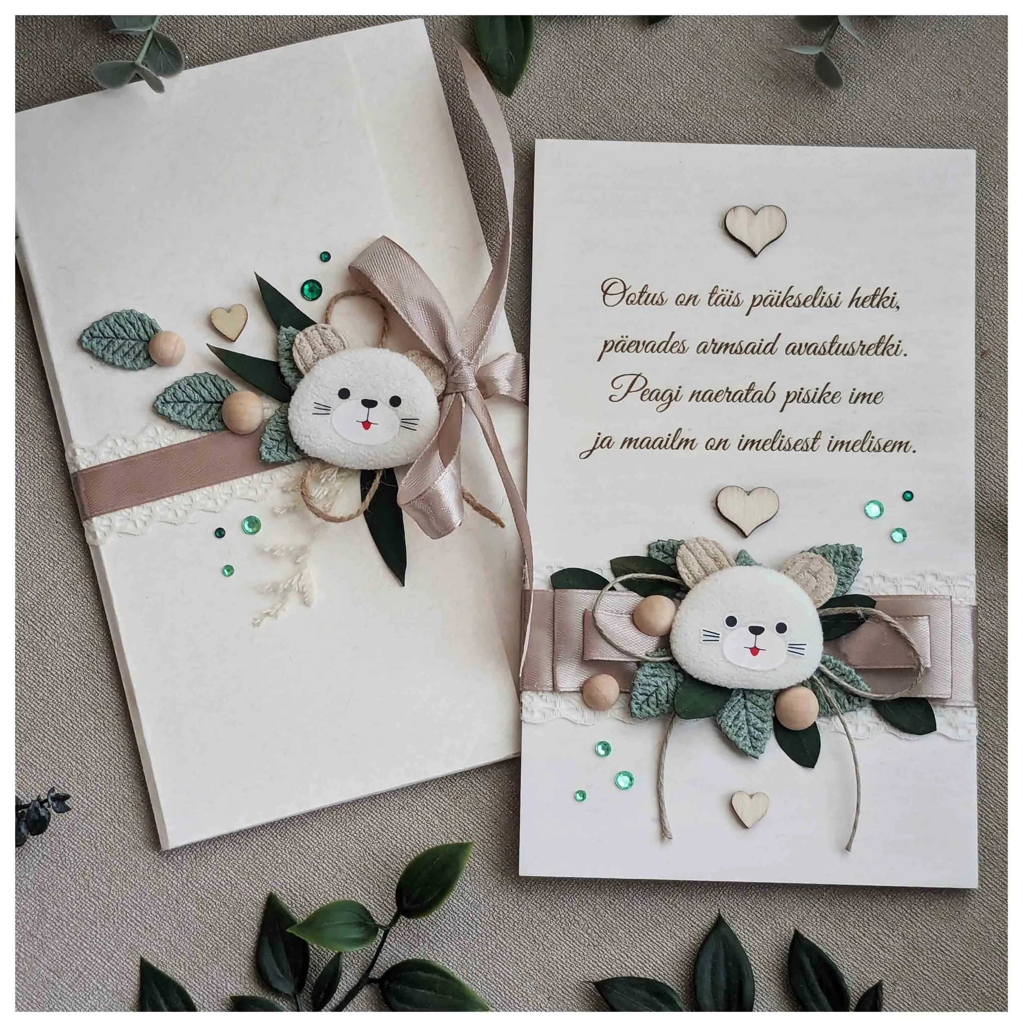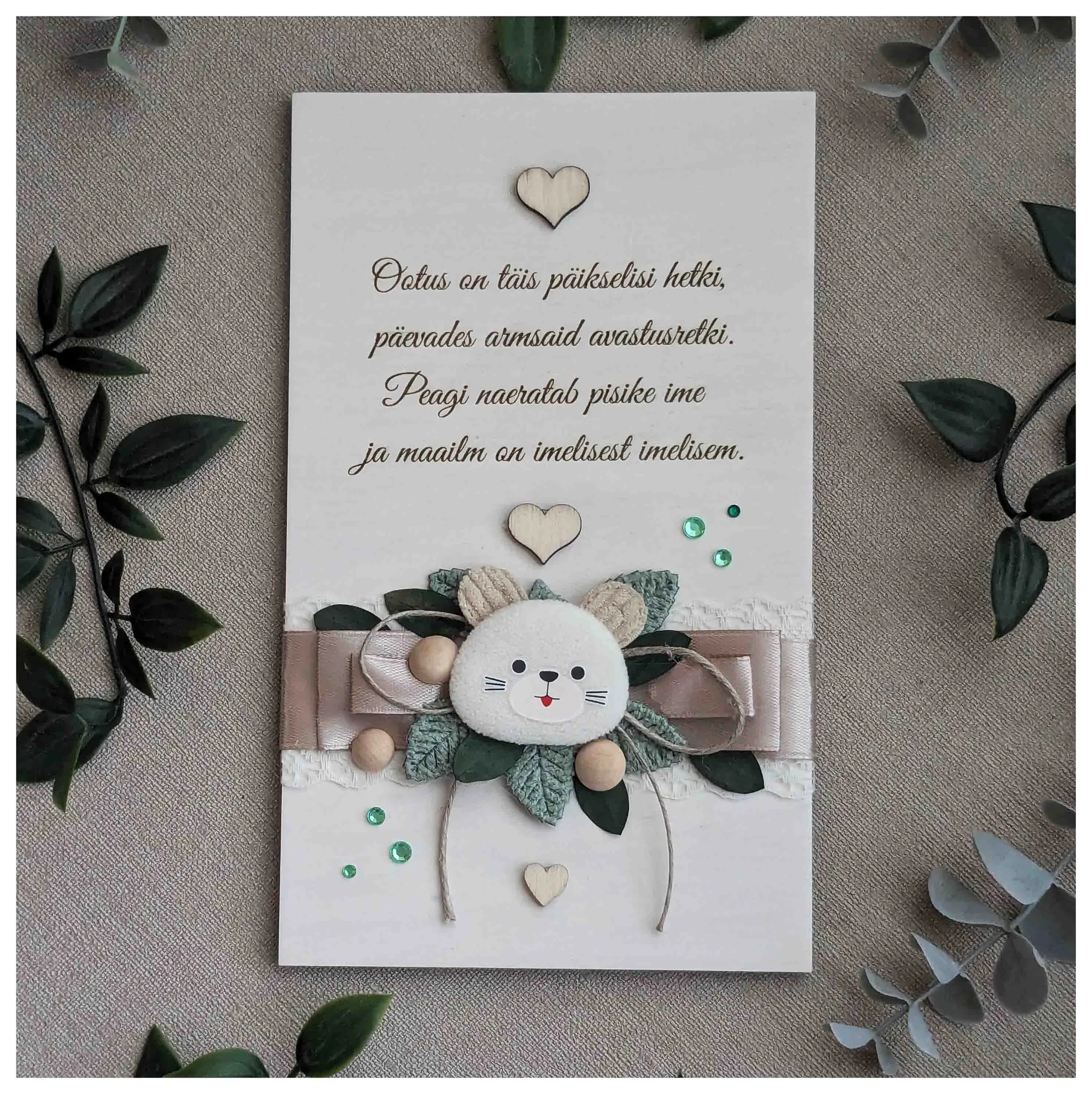 Puidust kaardi sätime käsitööna valmistatud ümbriku vahele. Kaarditasku sees on spetsiaalne koht kinkekaardi ning personaalse sõnumi lisamise jaoks. Puidust kaart ning ümbrik on loodud ühtseks tervikuks, mis kannavad endas helget ja õrna tooni.