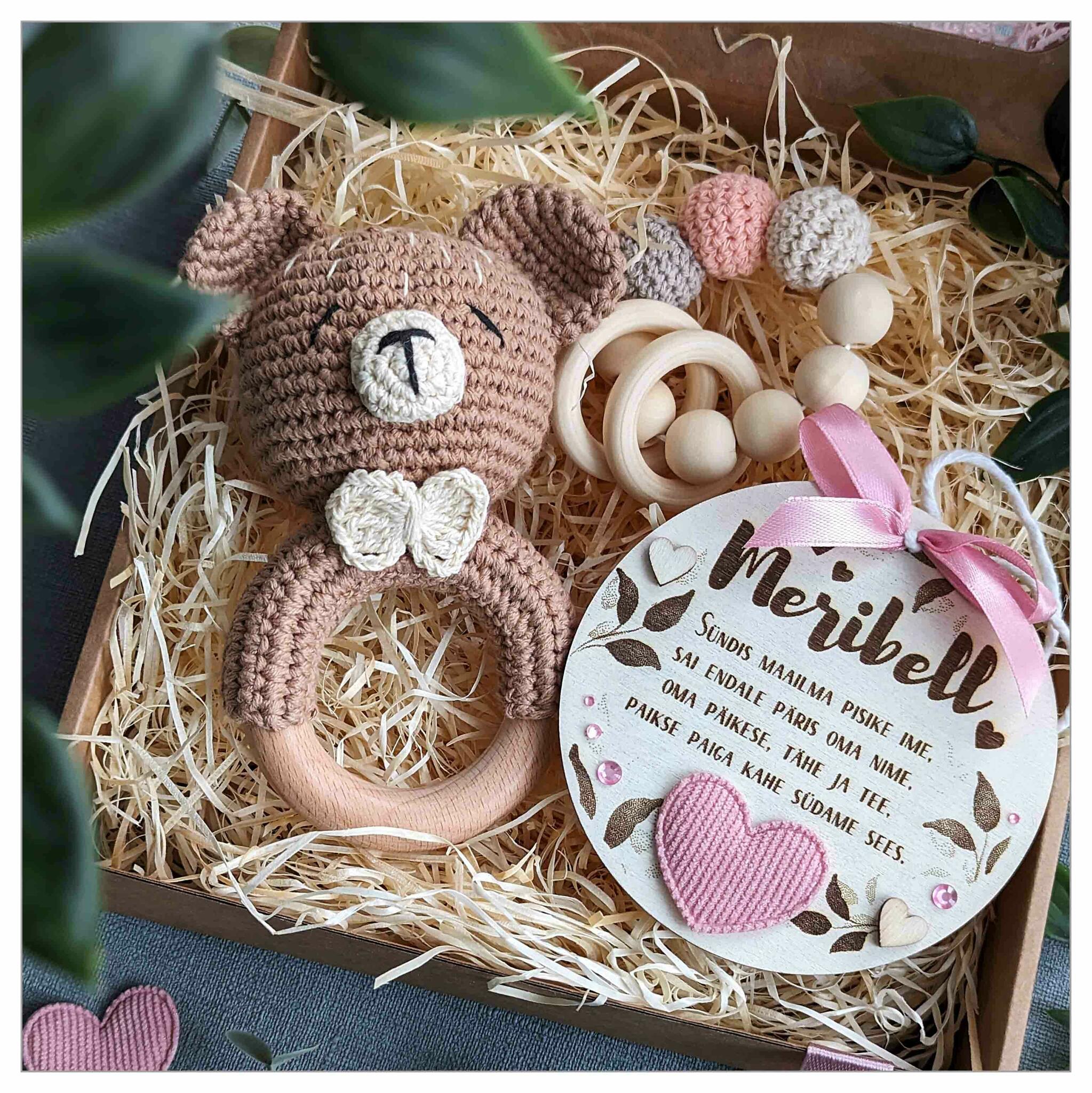 Panime kokku kinkekarbi, milles on heegeldatud mõmmiga kõristi, lutikett ja personaalse nimega ja salmiga puidust ümmargune kaart.