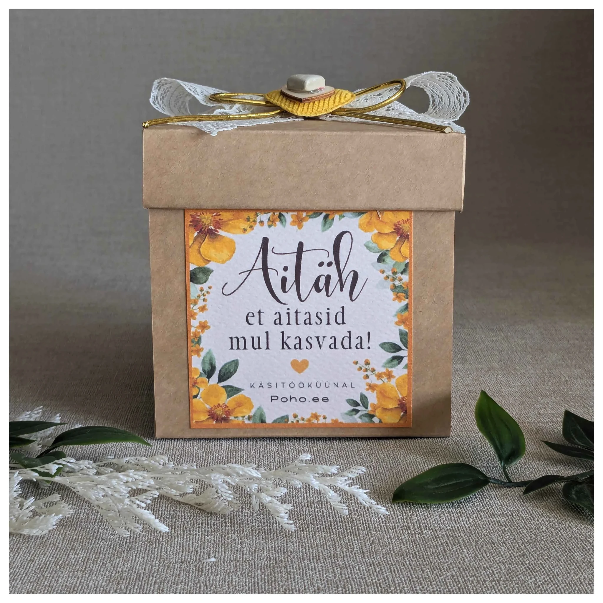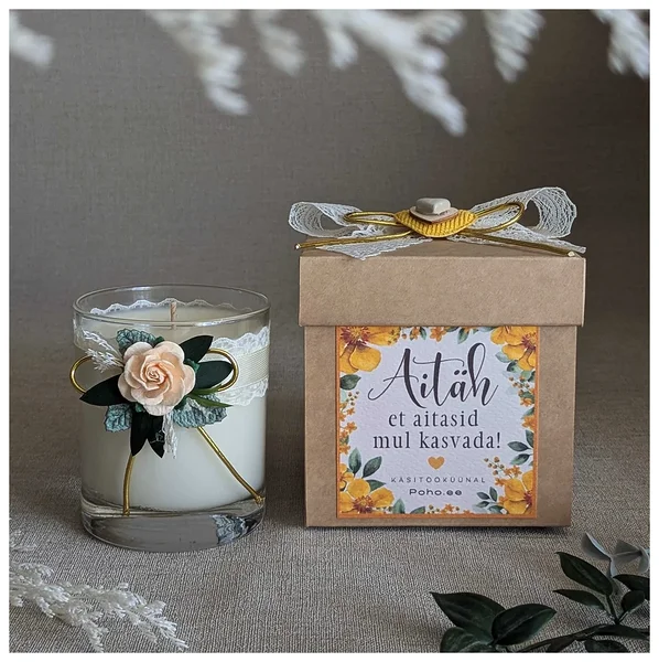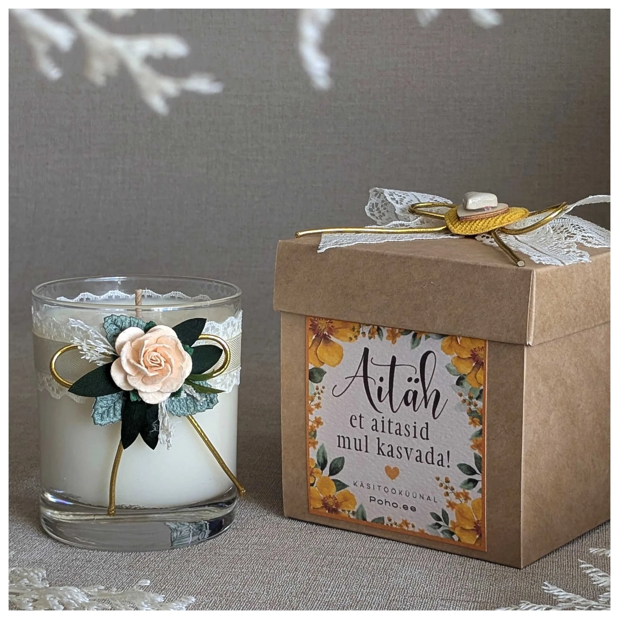 Küünal on ilusas kaanega karbis, mis on kaunistatud valmis kingituseks.