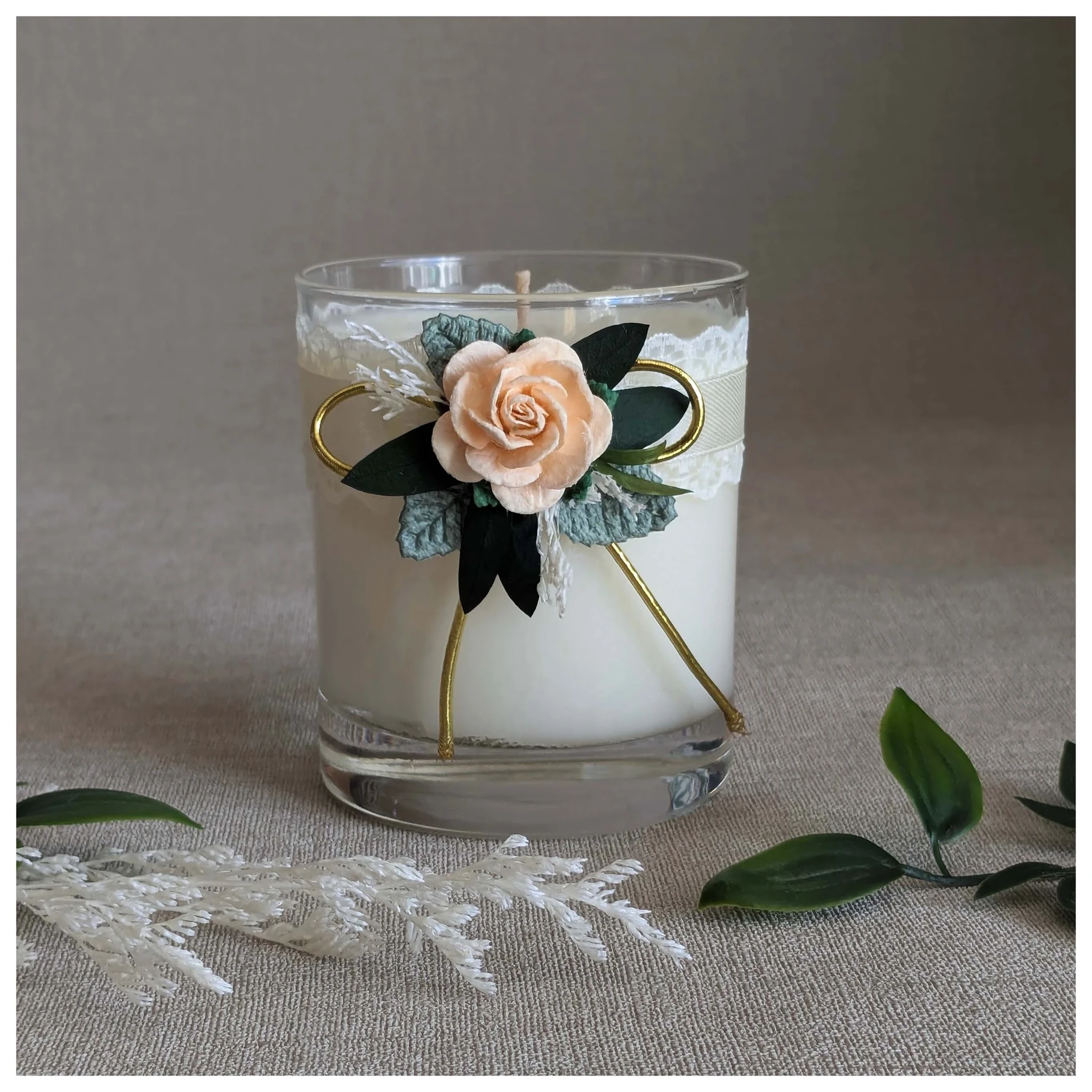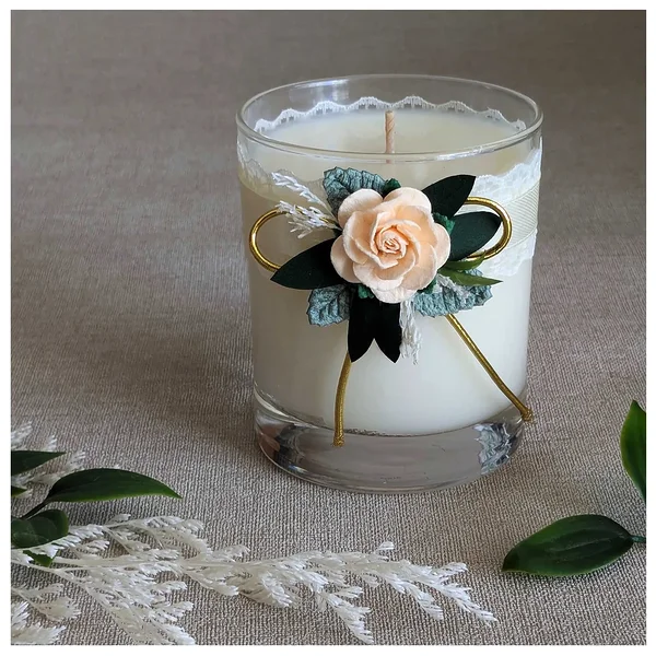 Küünal on valatud läbipaistvasse klaasi ning kaunistuseks on paelad, mooruspuu paberist lill, tekstiilist lehed ja stabiliseeritud eukalüpti lehed, mis loovad pehme ja naturaalse ilme.