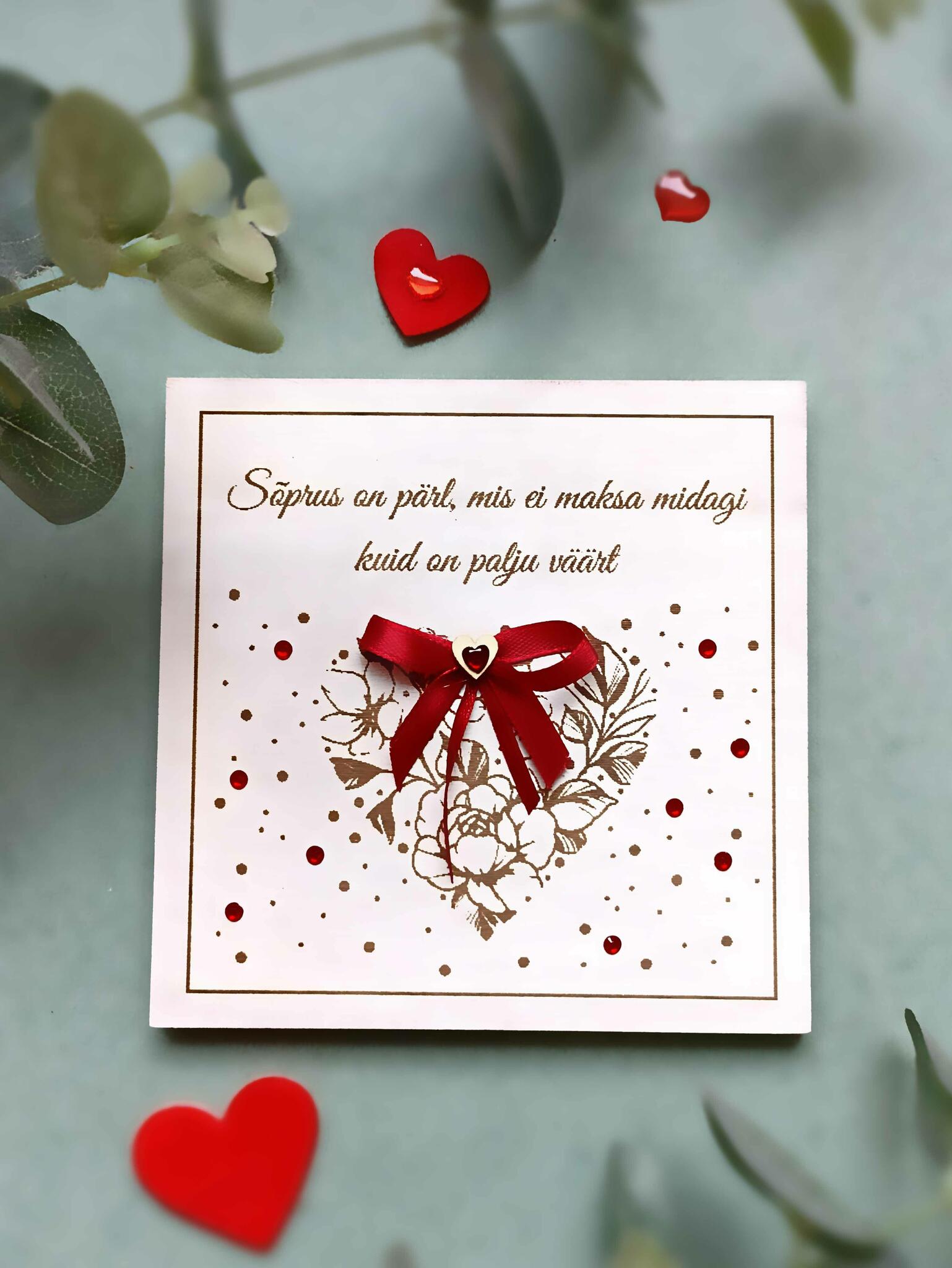 Puidust kaart jääb alles ka pikemaks ajaks kodu kaunistama ja ei kao sahtlipõhja ära. Kaart on valmistatud 4mm paksusest lihvitud vineerist, mis on toonitud keskkonnasõbraliku vahaga heledaks. Kaardi mõõdud on 14x14 cm. Teisele küljele on võimalik kirjutada oma personaalne soov. Kaart tuleb käsitsi tehtud ümbrikus.