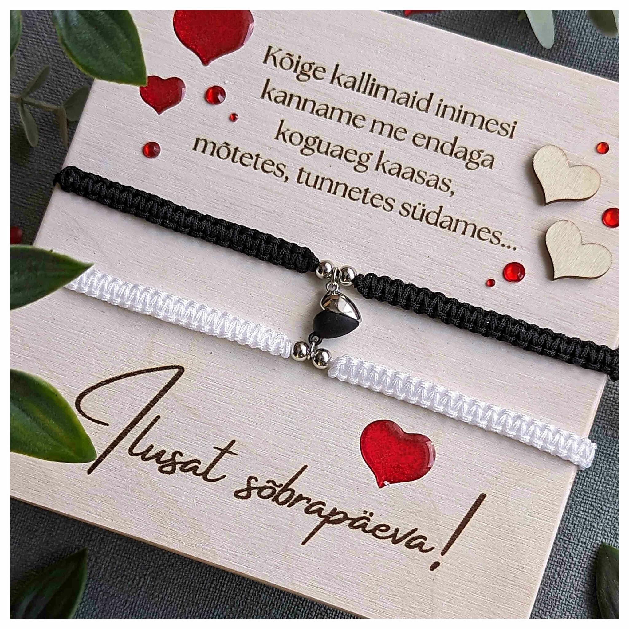 Kaardiga tuleb kaasa kaks käepaela - üks must ja üks valge. Käepaeltel on magnetiga süda, mis tõmbab teise südamepoolega kokku.