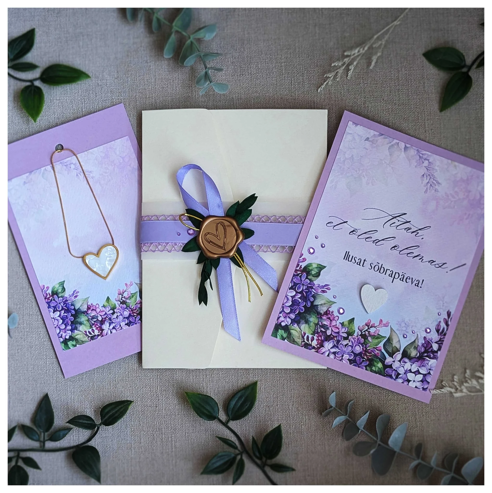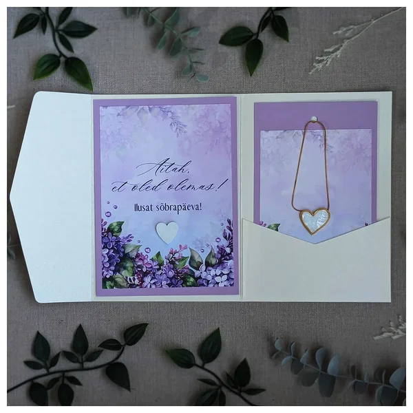 Kaardid: Ümbriku sees on kaks kvaliteetsest akvarellpaberist valmistatud kaarti. Kitsamale kaardile, mõõtudega 10.5 x 17 cm, on kinnitatud kingituseks mõeldud kaelakee. Teisel kaardil, mõõtudega 12.5 x 17 cm, on kirjas südamlik soov: ''Aitäh, et oled olemas! Ilusat sõbrapäeva!''. Soovi korral saad kaartide tagakülgedele kirjutada veel lisaks oma soovid.