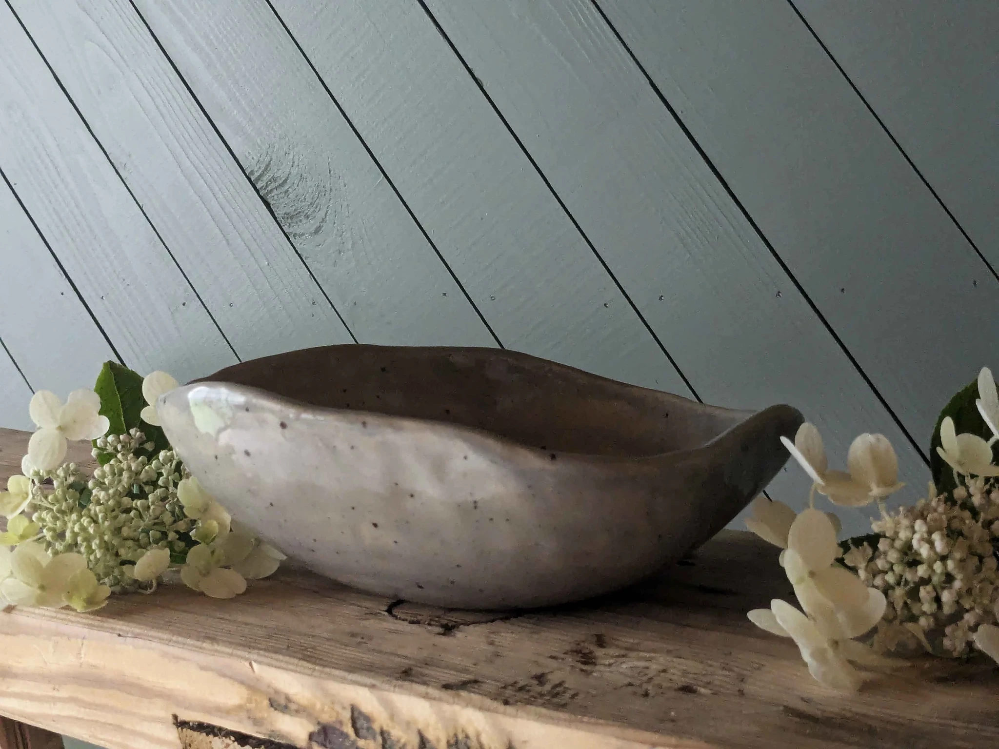 Küünal on kaunistatud stabiliseeritud hortensiaõite, eukalüptilehtedega– need on päris taimed, mille ilu ja värskus on spetsiaalse loodusliku töötluse abil säilitatud, et need püsiksid kaunid aastaid. Lisaks on veel kaunistuses kadakamarju ja kivikesi. Keraamiline kauss on valmistatud kõrgkuumusel põletamisel valgest savist, mis on üle tehtud hallika glasuuriga. Kaussi saab hiljem kasutada kööginõuna. Kausi mõõdud on umbes 20cm ja kõrgus 5-7 cm.